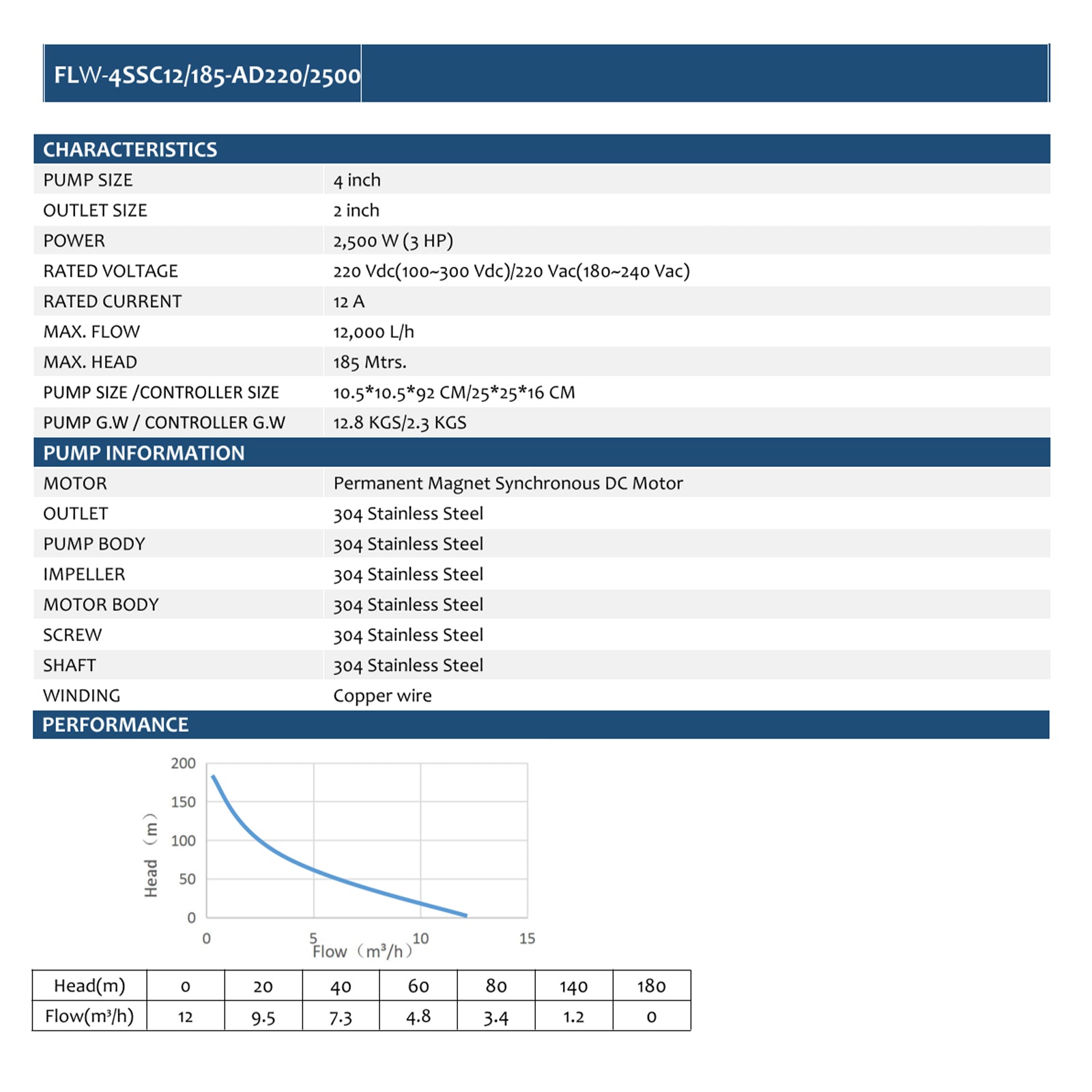 4inch 220VDC/VAC 2500W 185M Stainless Steel Solar Deep Well Submersible Pump