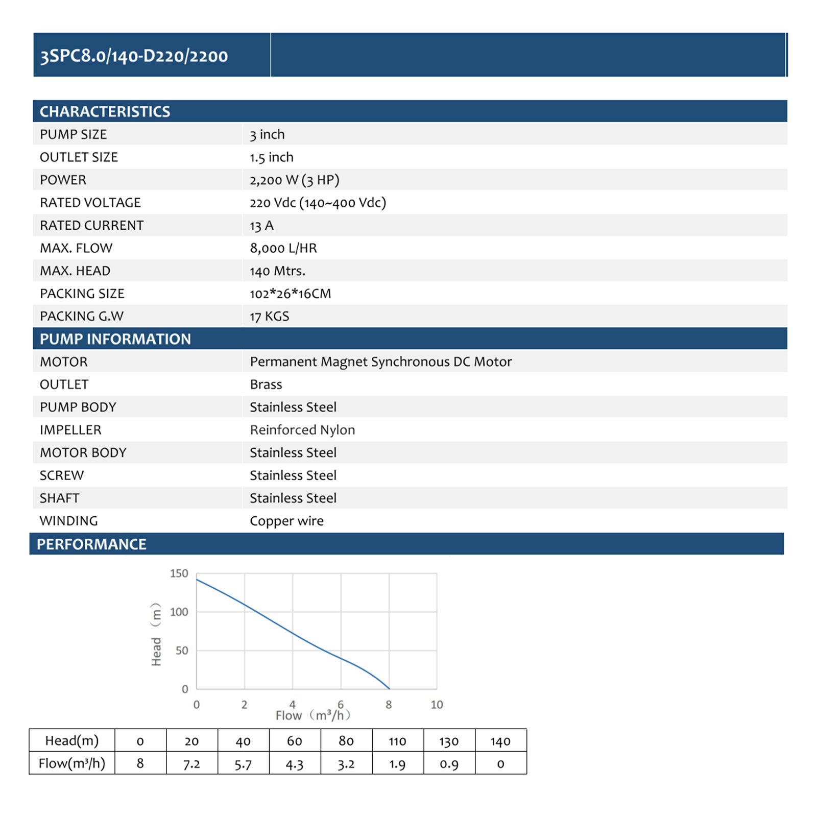 3inch 220VDC 2200W 140M Stainless Steel Reinforced Nylon Impeller Solar Deep Well Submersible Pump