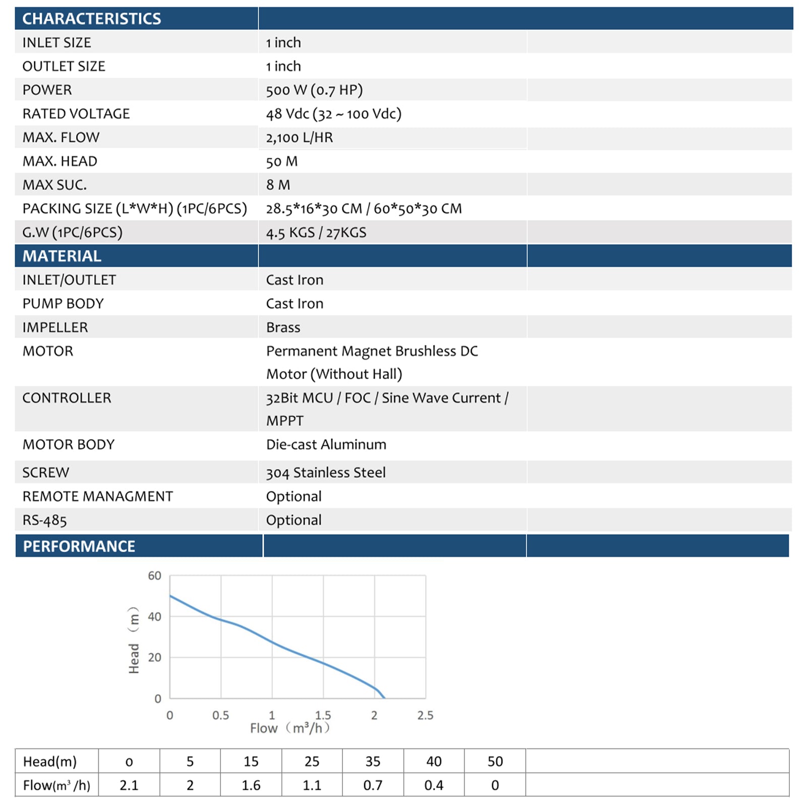 Features a cast iron body and brass impeller, combined with a hall sensor-free BLDC motor and 304 stainless steel screws, providing corrosion resistance and minimal maintenance for the solar water pump.