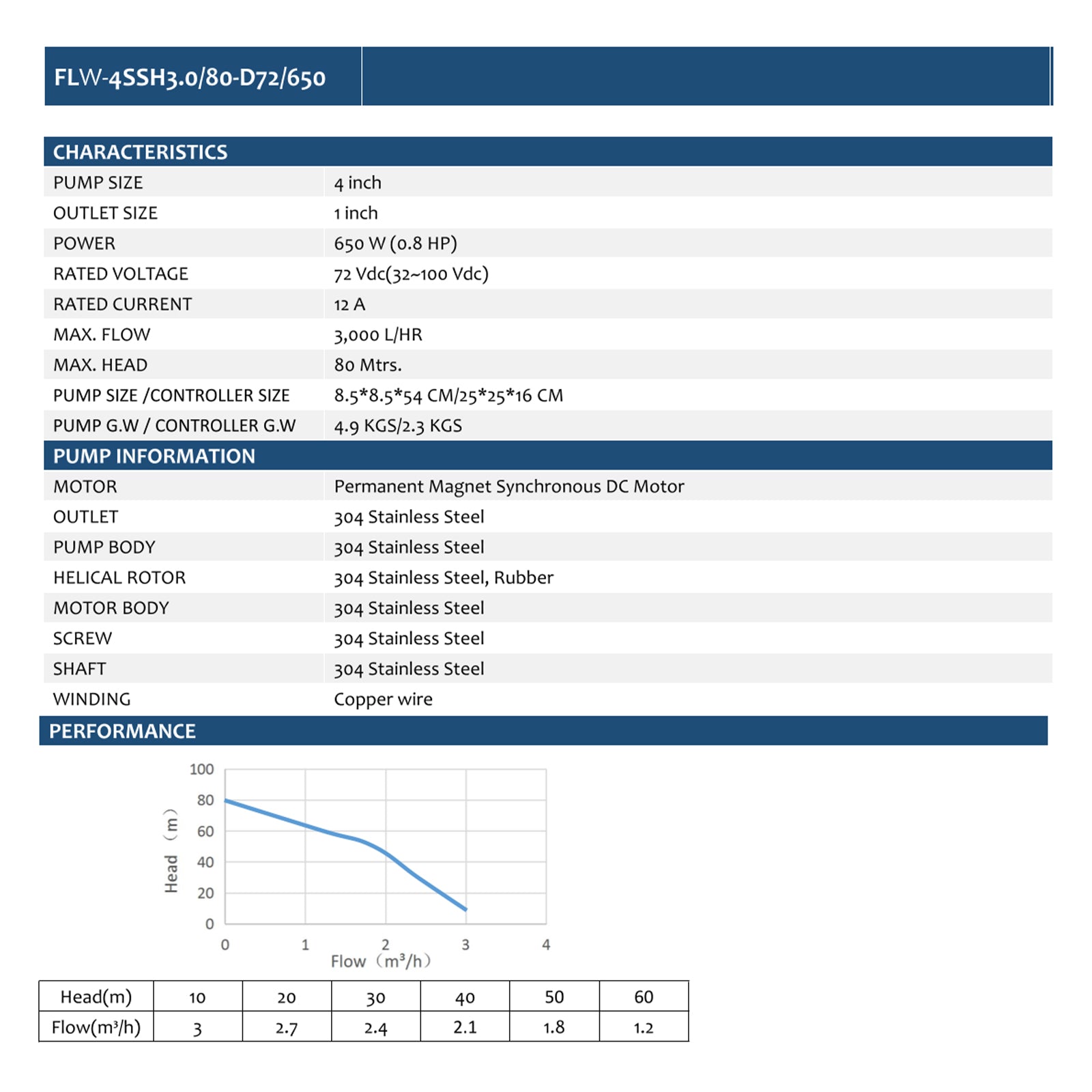 4inch 72VDC 650W 80M Stainless Steel Solar Deep Well Pump
